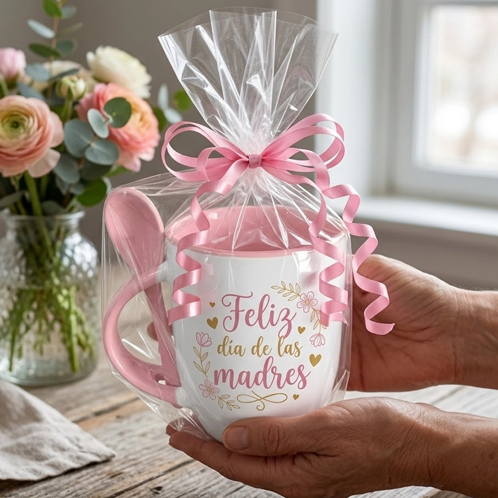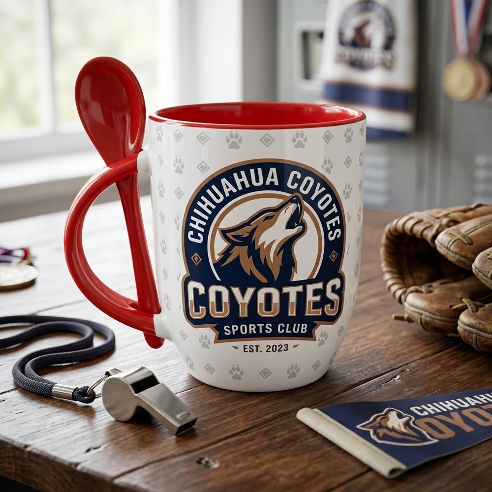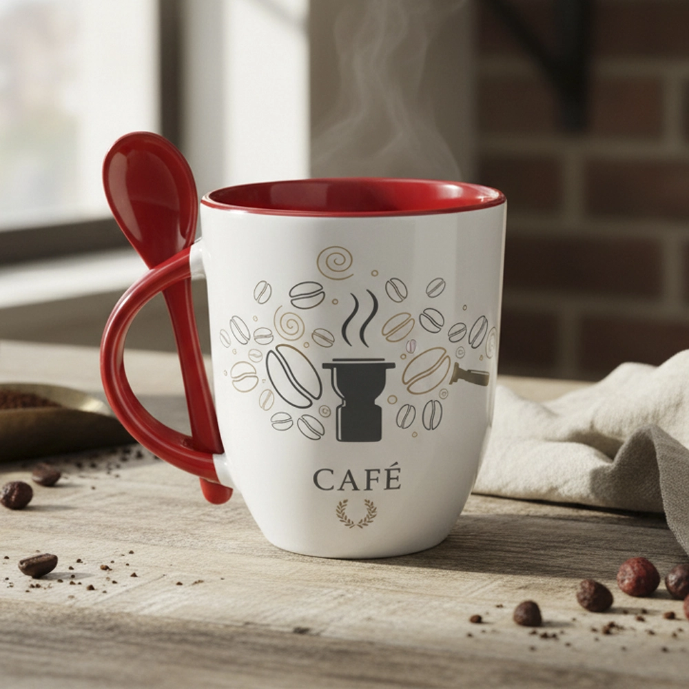 La taza elaborada de cerámica de color blanco, cuenta con una cuchara. Es ideal para la producción de artículos promocionales y de imagen gráfica.