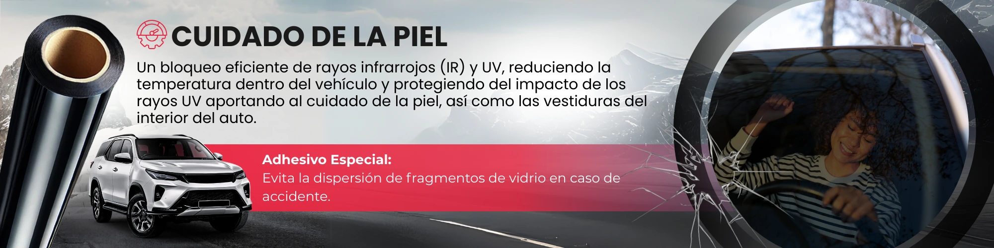 La Película con alto recubrimiento UV es una película polarizada diseñada para la protección solar avanzada, enfocada en bloquear los rayos UV y brindar seguridad en caso de rotura de vidrio. Su vinilo aislante térmico nano cerámico y nano pigmentos inorgánicos ayudan a reducir parte de la radiación infrarroja (IR), minimizando la acumulación de calor en el interior del auto.